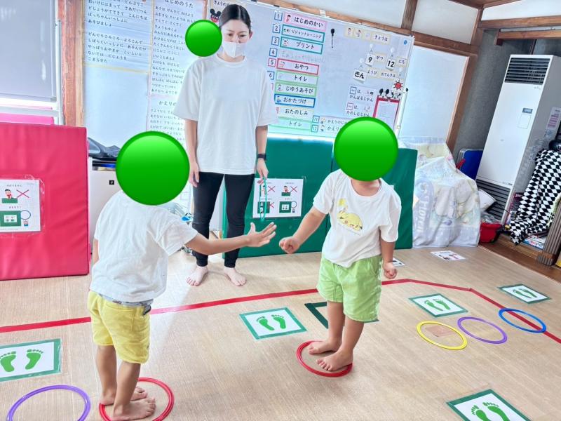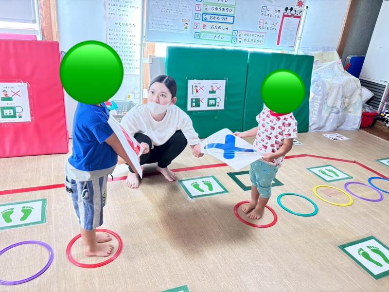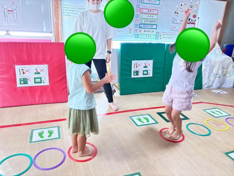 両端から輪の中を両足ジャンプで進み、お友達とじゃんけんをします!初めは負けると「まぁいっか」が言えないお友達や、言っても悔しさが顔に出てしまうお友達、泣き出すお友達がいました。負けたお友達が悔しがっているのを見て、勝ったお友達も喜ぶ事ができず、指導員に促され遠慮気味に「やったー」と喜んでました(>_<)