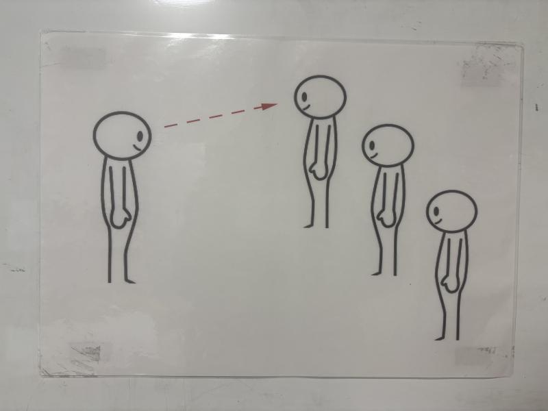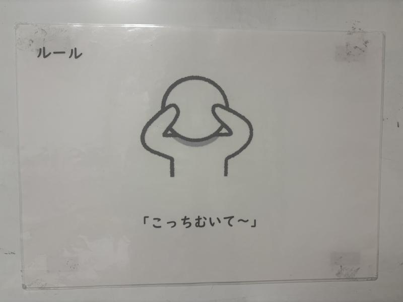 指導員が「こっち向いて」と言って手で目を隠し、次に「はい」と言って目隠しを外して誰かの目を見ます。