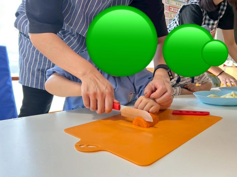 「包丁はネコの手だよ!」と教えてくれたお友達がいました。その言葉を聞いて、「こうだよね」とネコの手の見本を見せてくれるお友達もいました^_^