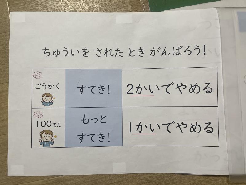 普段の生活から自由遊びの時間などに先生や、お友達に「やめて」と言われた時に2回以内で辞めることができたら素敵!100点だよ!と褒めていきました。