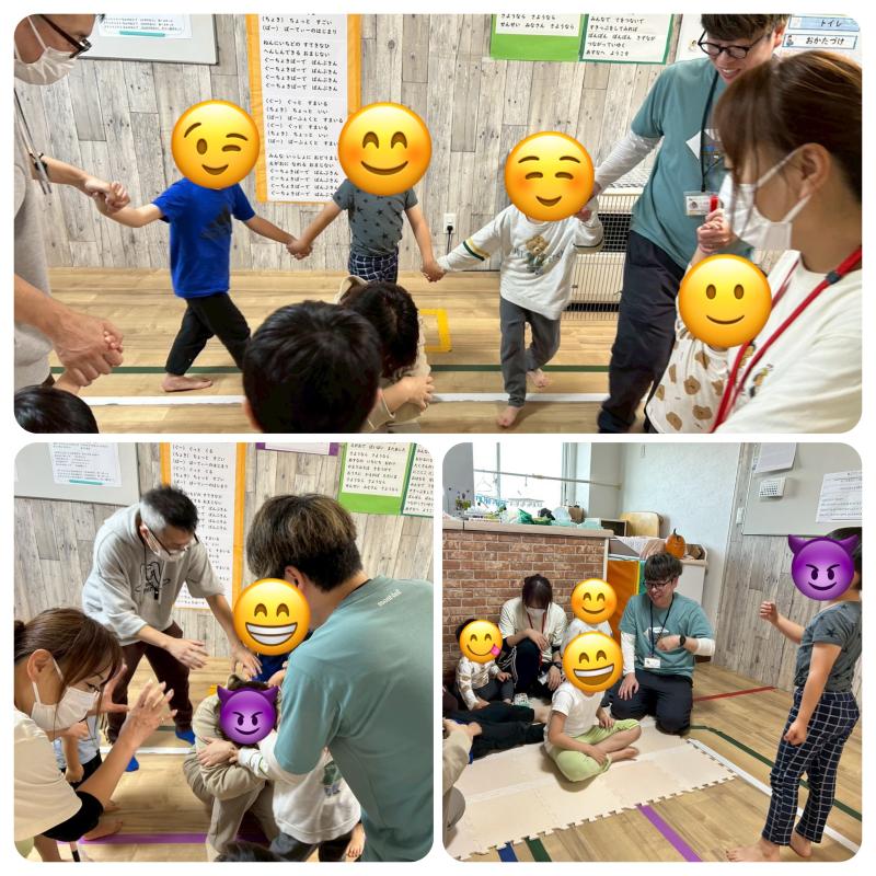 2歳〜6歳のお友達が手をつなぎ、子ども同士の共感や協力することの楽しさを育むことができたり、歌の歌詞と動きが連動しているので、特に1.2歳児の子への言葉の発達にも良いと言われている療育です。