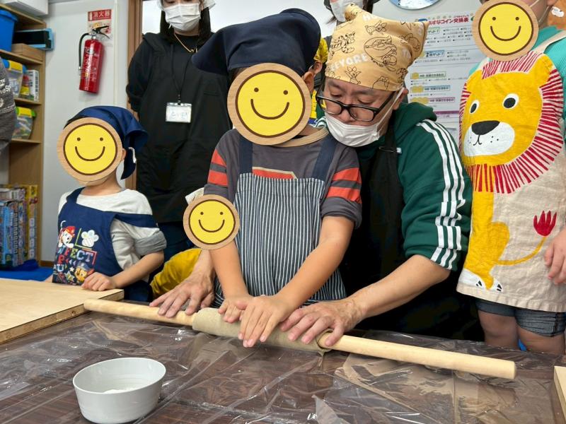 生地をしっかりコネコネして麺棒で力加減しながら薄く伸ばしています♬