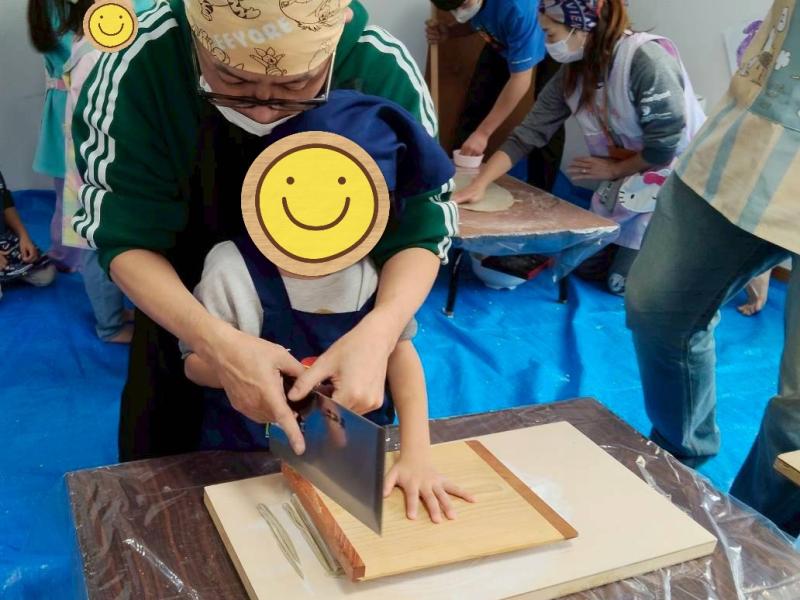 蕎麦用の包丁で1人ずつ先生に補助してもらいながら、ゆっくりと切って、切れた蕎麦を見てとっても満足気!