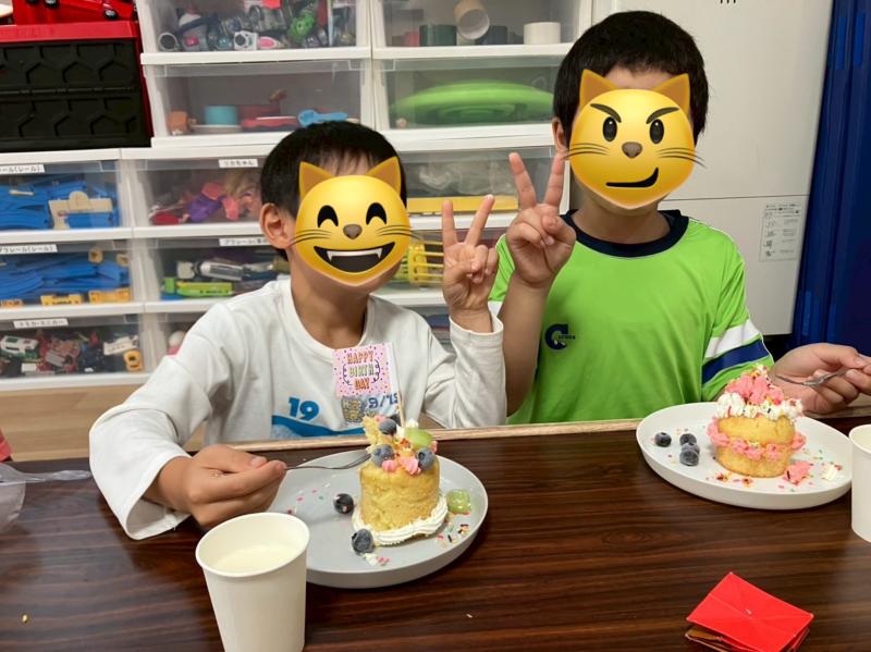 白とピンクのクリームを選んで自分たちで絞り、フルーツとカラースプレーで自分たちの思い思いに飾り付けしましたよ♪